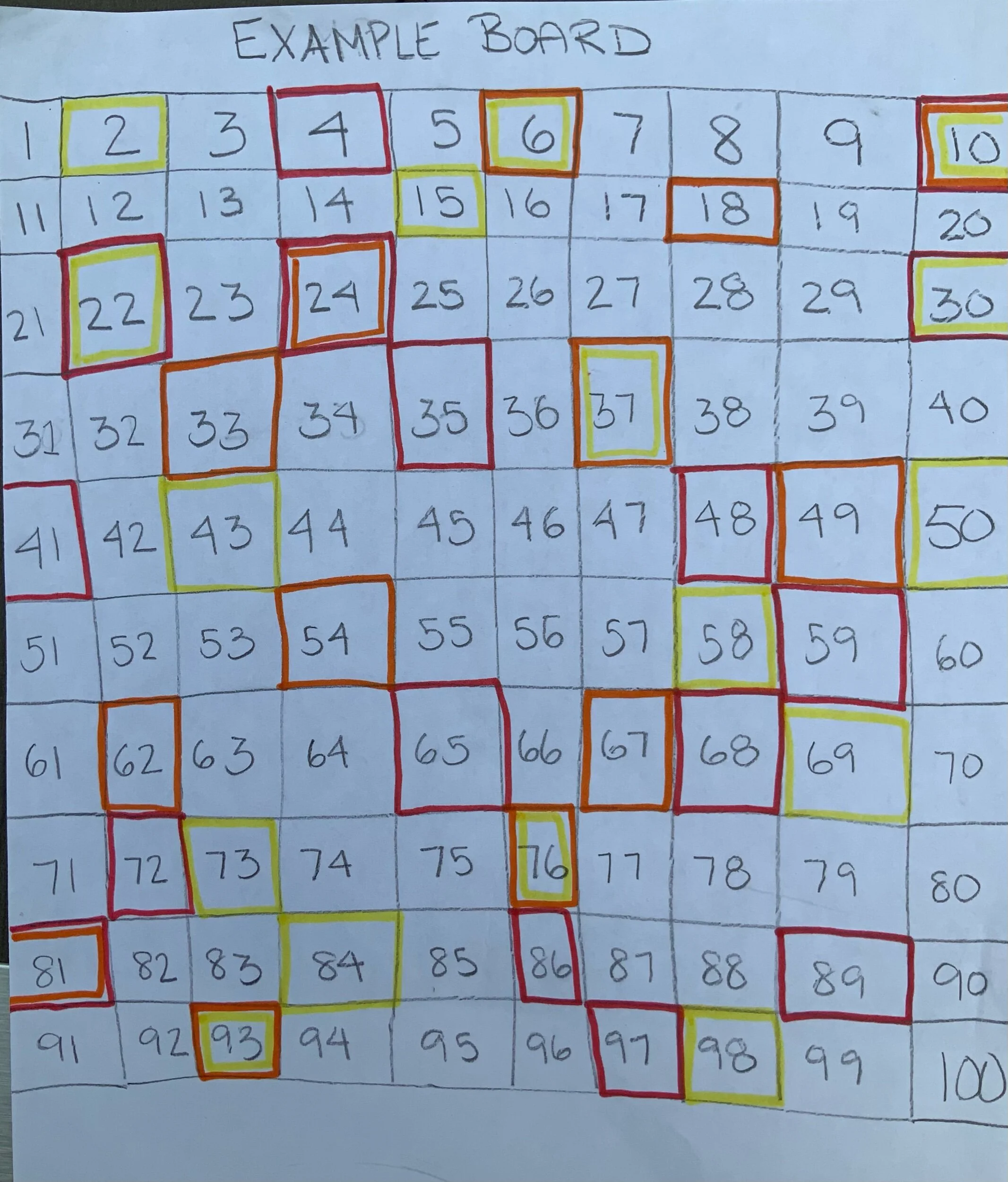 On a blank piece of paper, draw a 10X10 grid big enough to write the numbers 1-100 with one number per square. Each player gets a different color marker. Taking turns, each player rolls two dice and counts that many spaces on the board starting at 1 for their first turn and continuing through to 100. When the player counts out their spaces for that turn and lands on the last space they must say that number. If the number is said correctly they then mark that space with their marker (either with an X or by outlining the square). If they don’t say the number correctly, they loose their turn and the next player goes. The player that makes it to 100 first wins!