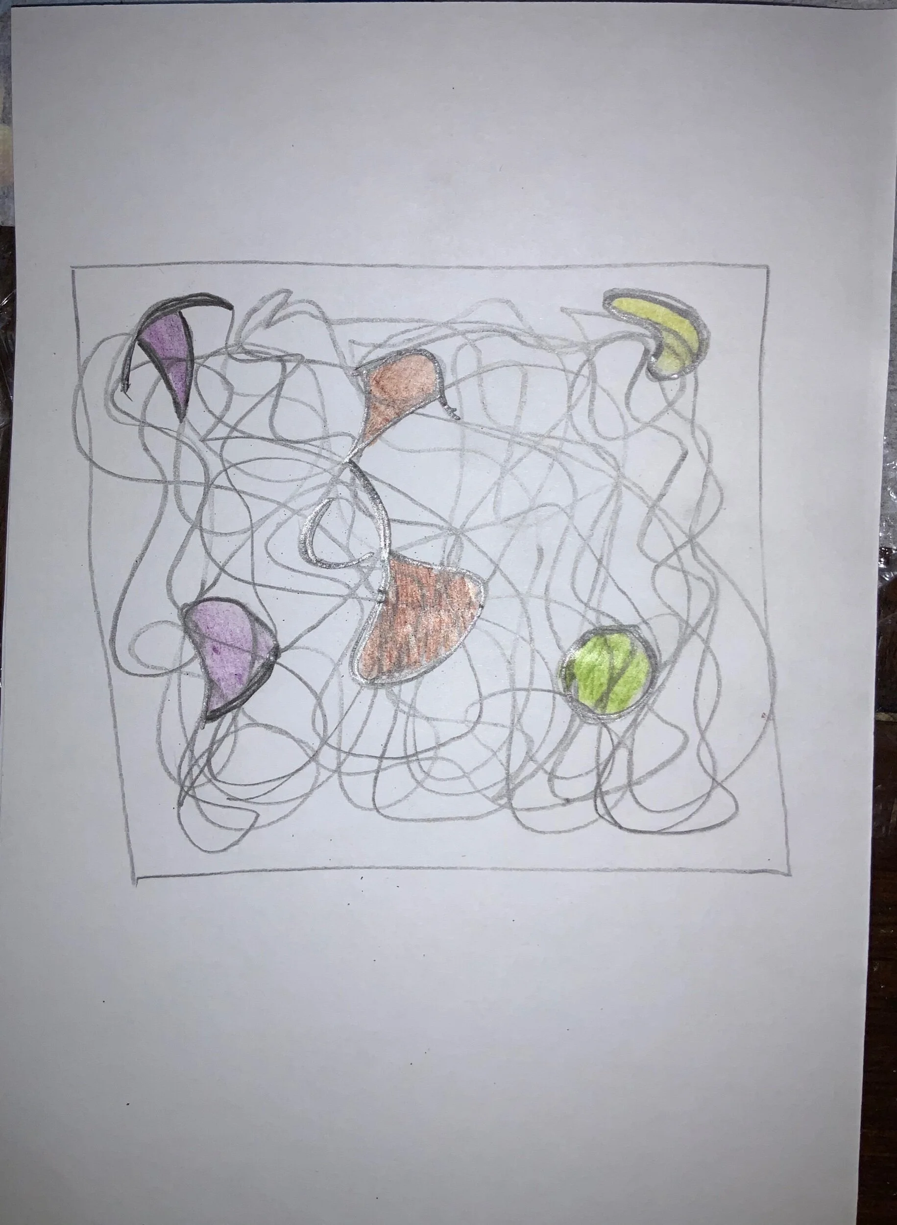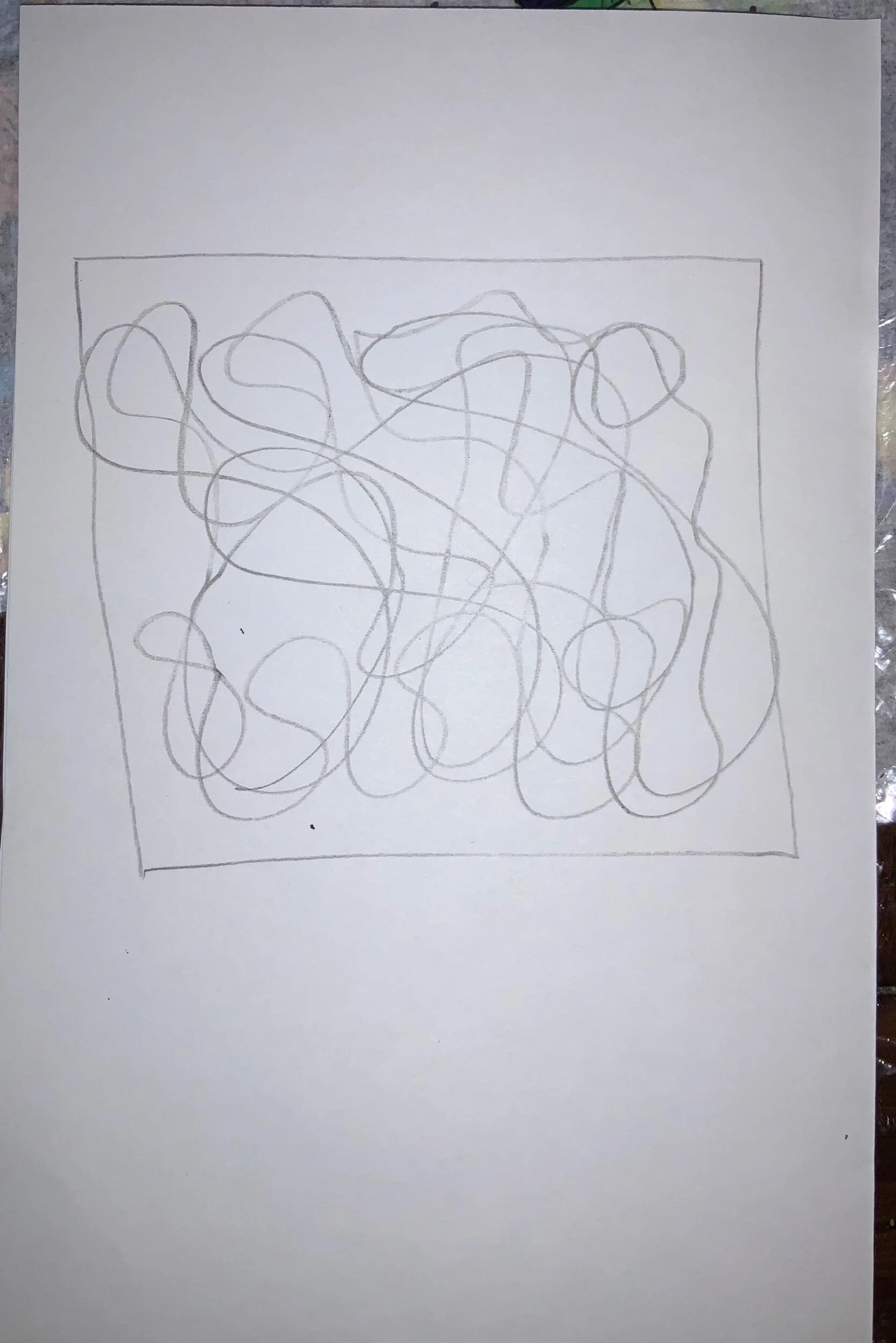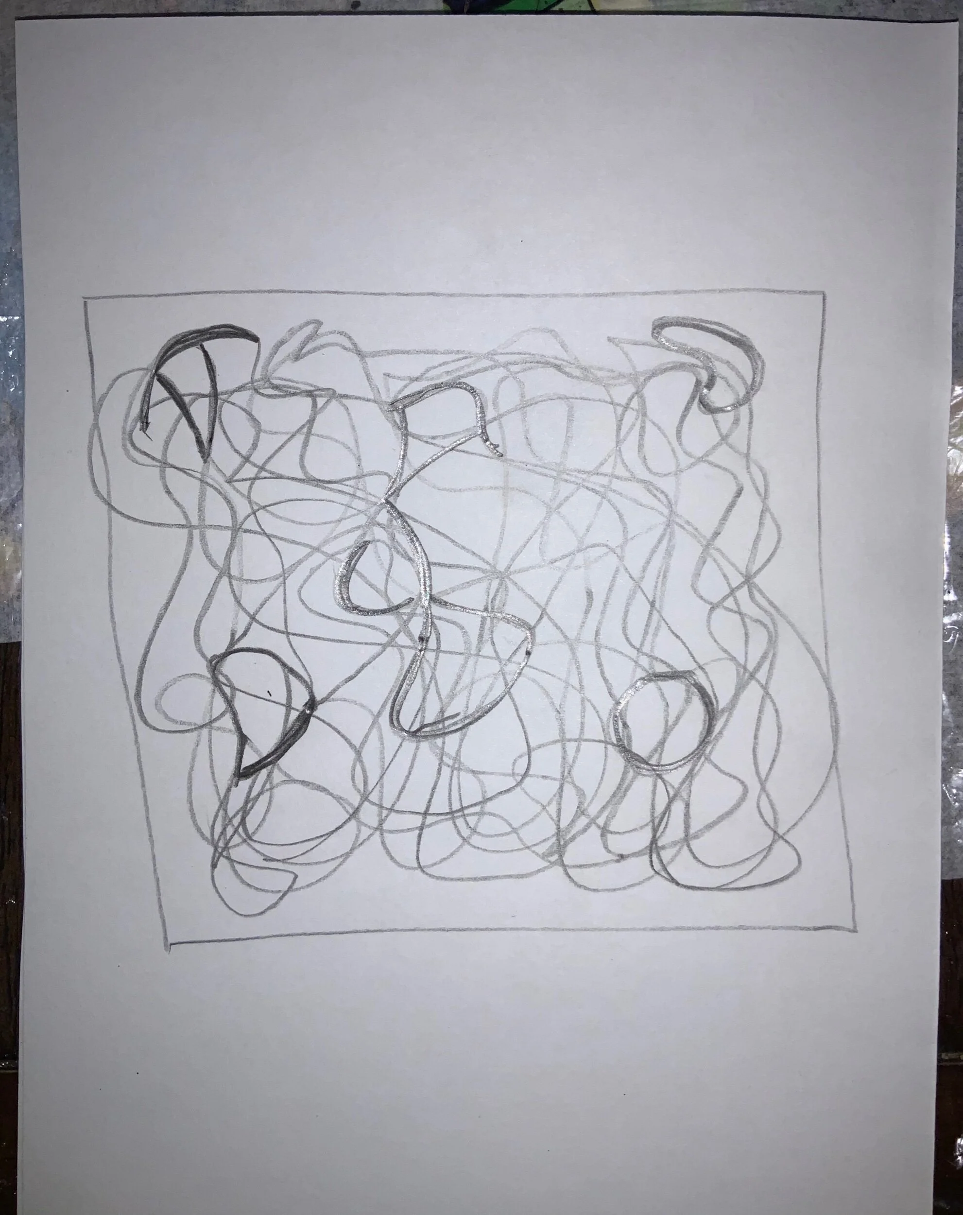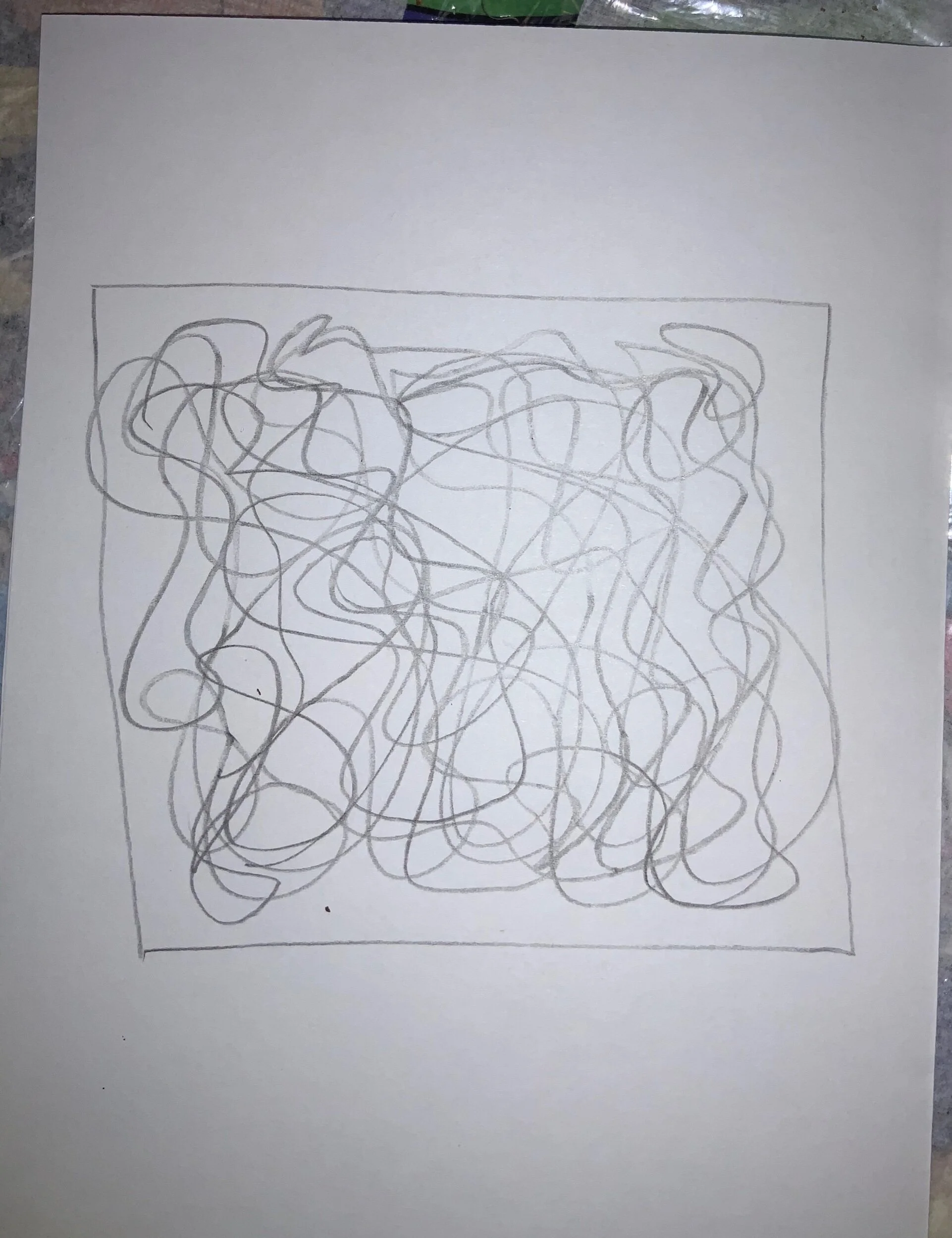 Take your pencil and draw droopy lines inside the frame that you created. Make as many overlapping lines as you would like until you start to see shapes appear.