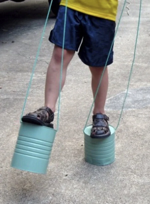 Using a hammer and nail, make 2 holes near the base of the can, one on either side. Tie the string inside one hole with a loop long enough that your child can hold it taut when stepping on the can, and then tie the second knot into the other hole. Decorate however you’d like and enjoy!